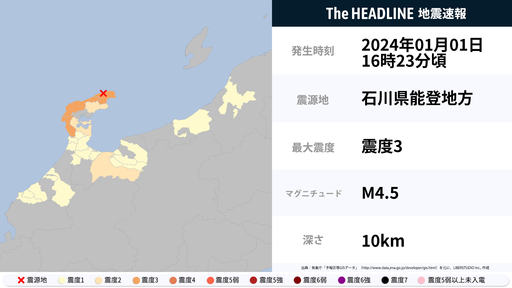 1月1日16時23分頃、石川県で最大震度3の地震を観測