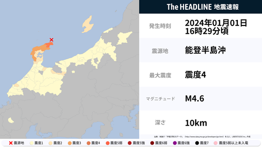 1月1日16時29分頃、石川県で最大震度4の地震を観測