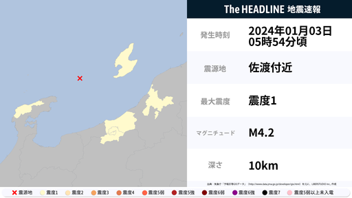 1月3日5時54分頃、新潟県・石川県で最大震度1の地震を観測