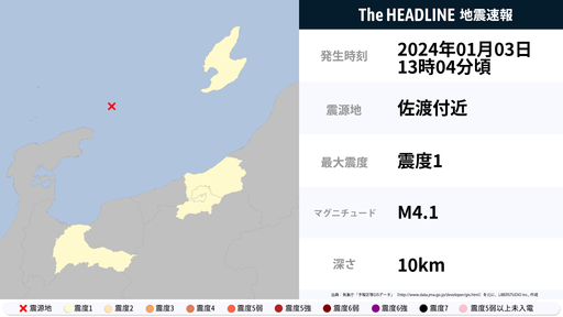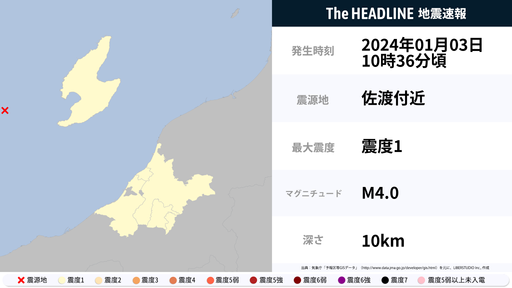 1月3日10時36分頃、新潟県で最大震度1の地震を観測