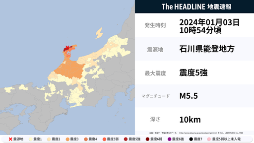 1月3日10時54分頃、石川県で最大震度5強の地震を観測