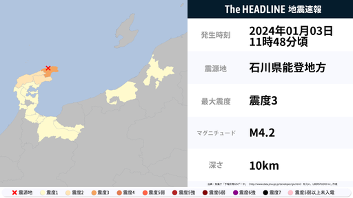 1月3日11時48分頃、石川県で最大震度3の地震を観測