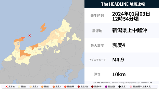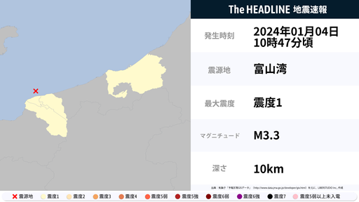 1月4日10時47分頃、新潟県・富山県で最大震度1の地震を観測
