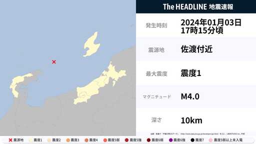 1月3日22時9分頃、新潟県で最大震度1の地震を観測