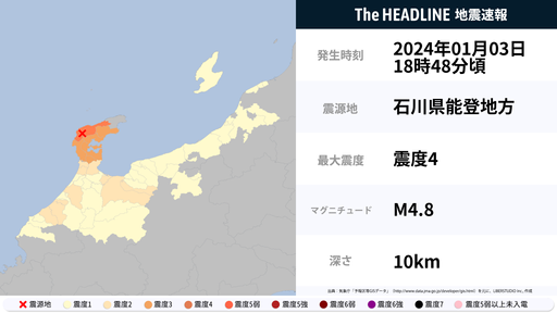 1月3日18時48分頃、石川県で最大震度4の地震を観測