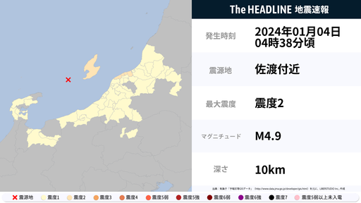 1月4日4時38分頃、新潟県で最大震度2の地震を観測