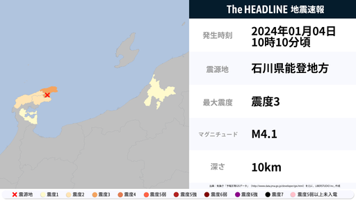1月4日10時10分頃、石川県で最大震度3の地震を観測