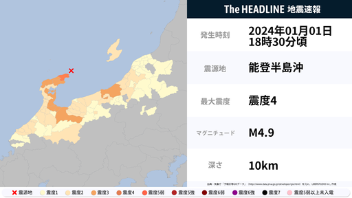1月1日18時30分頃、石川県で最大震度4の地震を観測