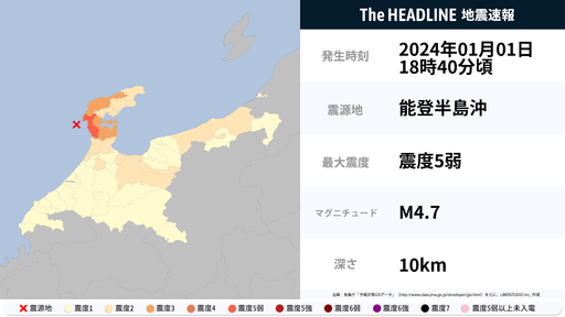 1月1日18時40分頃、石川県で最大震度5弱の地震を観測