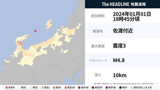 1月1日18時30分頃、石川県・新潟県などで震度3以上の地震を観測