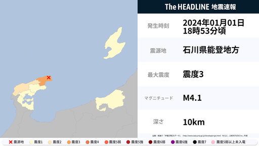 1月1日18時53分頃、石川県で最大震度3の地震を観測
