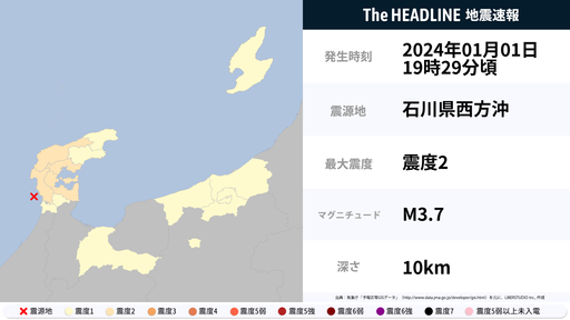 1月1日19時29分頃、石川県で最大震度2の地震を観測