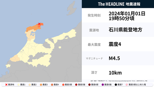 1月1日19時50分頃、石川県で最大震度4の地震を観測