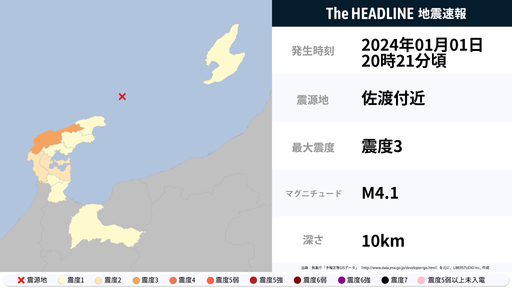 1月1日20時21分頃、石川県で最大震度3の地震を観測