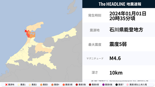 1月1日20時35分頃、石川県で最大震度5弱の地震を観測