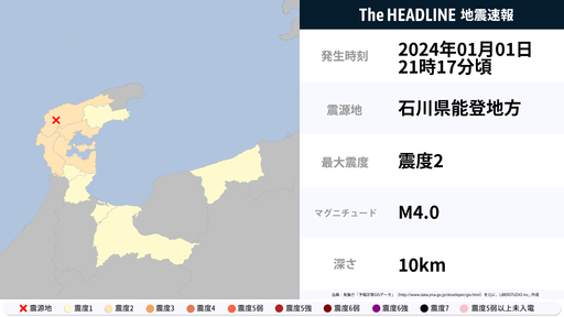 1月1日21時17分頃、石川県で最大震度2の地震を観測