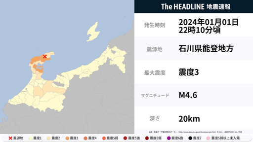 1月1日22時11分頃、石川県で最大震度3の地震を観測