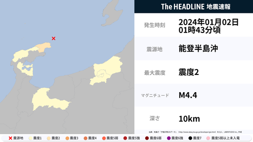 1月2日1時43分頃、石川県で最大震度2の地震を観測