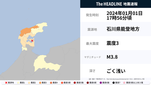 1月1日17時56分頃、石川県で最大震度3の地震を観測