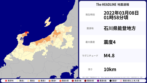 3月8日01時58分頃、石川県で最大震度4を観測する地震がありました。