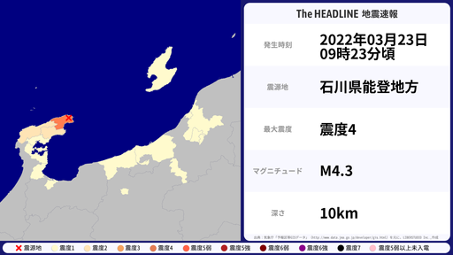 3月23日09時23分頃、石川県で最大震度4を観測する地震がありました。