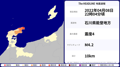 4月8日22時04分頃、石川県で最大震度4を観測する地震がありました。