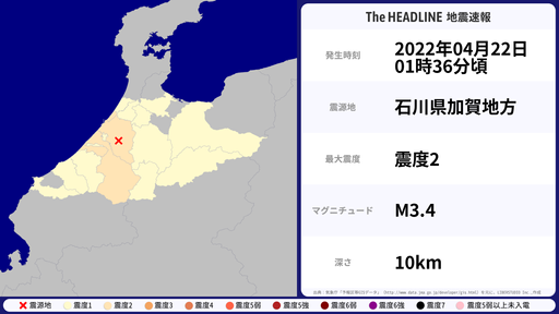 4月22日01時36分頃、石川県で最大震度2を観測する地震がありました。