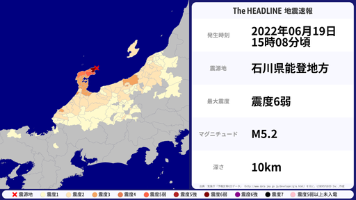 6月19日15時08分頃、石川県で最大震度6弱を観測する地震がありました。