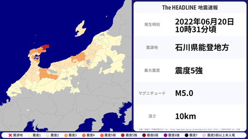 6月20日10時31分頃、石川県で最大震度5強を観測する地震がありました。