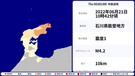 6月21日10時42分頃、石川県で最大震度3を観測する地震がありました。