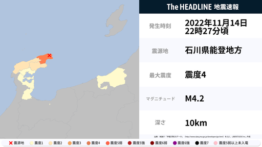 11月14日22時28分頃、石川県で最大震度4の地震を観測