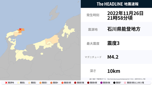 11月26日21時58分頃、石川県で最大震度3の地震を観測