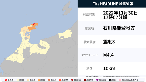 11月30日17時7分頃、石川県で最大震度3の地震を観測