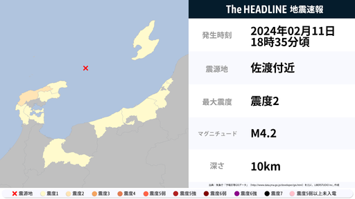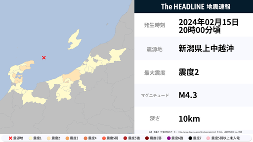 2月15日12時48分頃、新潟県で最大震度3の地震を観測