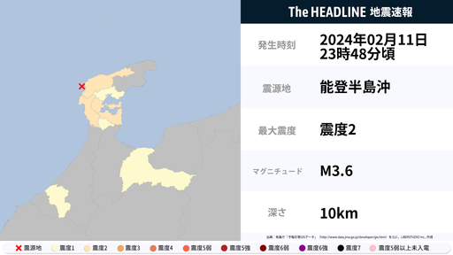 2月11日23時49分頃、石川県で最大震度2の地震を観測
