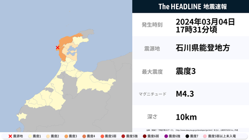 3月4日17時31分頃、石川県で最大震度3の地震を観測