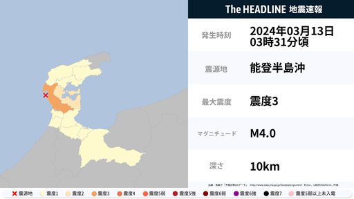 3月13日3時31分頃、石川県で最大震度3の地震を観測