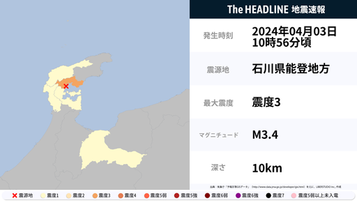 4月3日10時56分頃、石川県で最大震度3の地震を観測