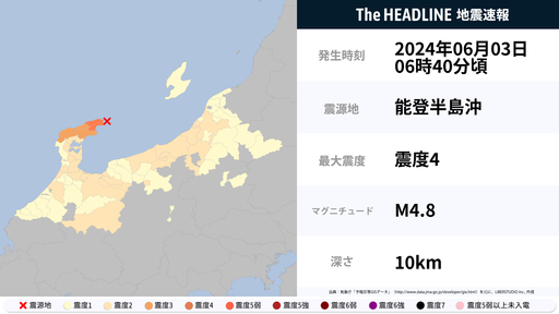 6月3日6時40分頃、石川県で最大震度4の地震を観測
