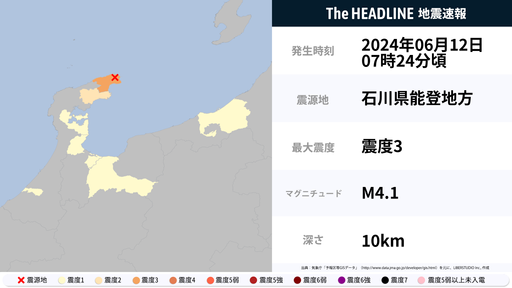 6月12日7時24分頃、石川県で最大震度3の地震を観測