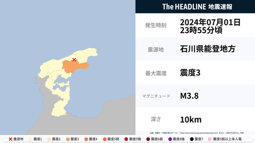 7月1日23時55分頃、石川県で最大震度3の地震を観測