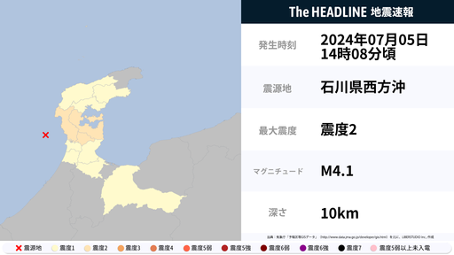 7月5日14時8分頃、石川県で最大震度2の地震を観測