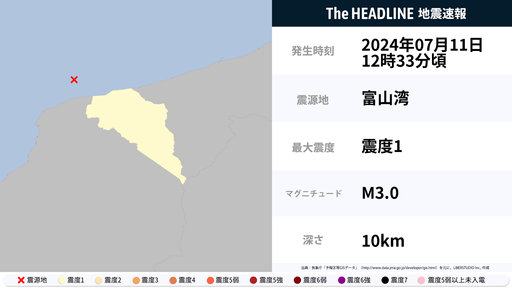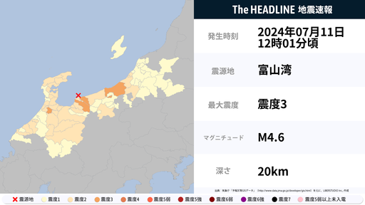 7月11日12時1分頃、新潟県・富山県で最大震度3の地震を観測