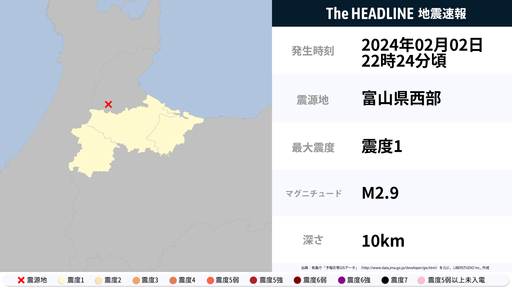 2月2日22時24分頃、富山県で最大震度1の地震を観測