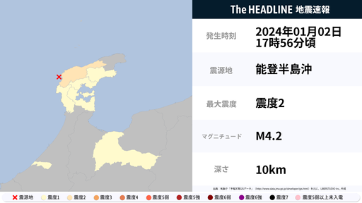 1月2日17時56分頃、石川県で最大震度2の地震を観測