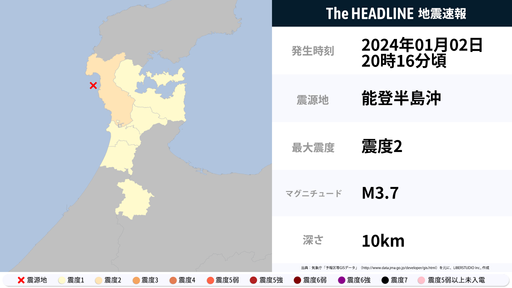 1月2日20時16分頃、石川県で最大震度2の地震を観測