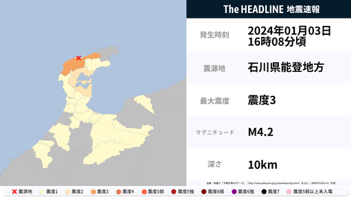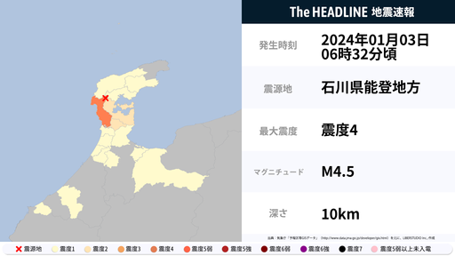 1月3日6時32分頃、石川県で最大震度4の地震を観測
