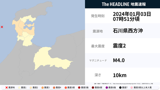 1月3日7時51分頃、石川県で最大震度2の地震を観測