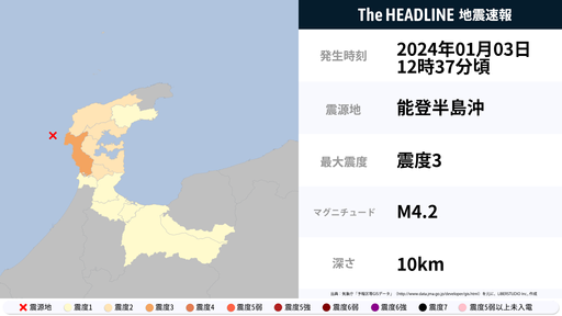 1月3日12時37分頃、石川県で最大震度3の地震を観測