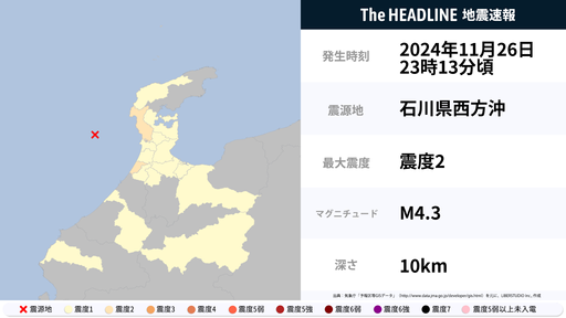 11月26日23時13分頃、石川県で最大震度2の地震を観測